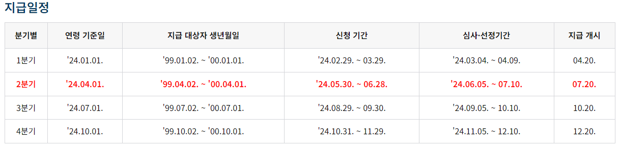 '24년 2분기 신청기간은 2024.05.30.(목) 09:00 ~ 2024.06.28.(금) 18:00으로, 분기별 지급 대상자 생년월일과 신청기간, 심사·선정기간, 지급 개시 일은 아래의 표를 참고해 주시기 바랍니다.