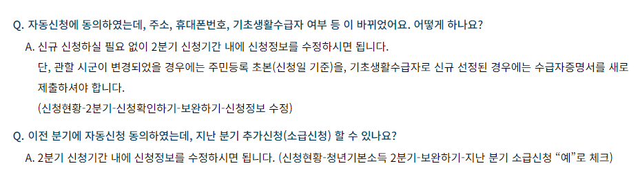 주소, 휴대폰번호, 기초생활수급자 여부 등이 바뀌었을 경우 당황하지 않으셔도 됩니다. 이러한 경우 대응방법과 지난 분기 추가 신청(소급신청) 방법은 아래의 내용을 확인해 주시기 바랍니다.