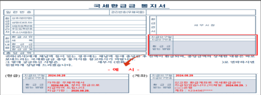 현금수령으로 신청한 경우 「국세환급금 통지서」가 등기우편으로 발송되며, 통지서를 받지 못한 경우 홈텍스 등에서 출력이 가능합니다.