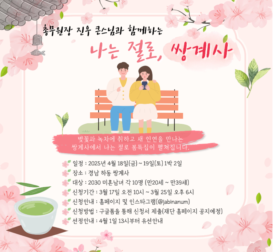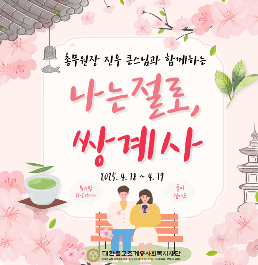 올해 첫 번째 행사는 특별히 조계종 총무원장 진우 스님이 직접 ‘주선자’로 나서 더욱 기대를 모으고 있고, 모집 마감 전까지 선착순이 아니므로 빠르게 지원하는 것이 유리 합니다.