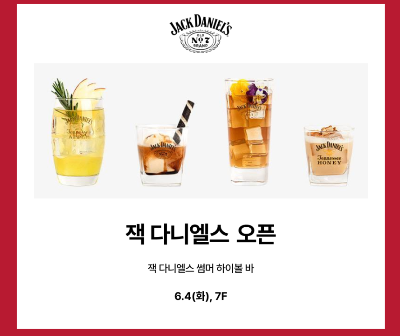 프리미엄 아메리칸 테네시 위스키 잭 다니엘스가 오는 2024년 6월 4일(화)부터 9월 1일(일) 까지 약 세 달간 스타필드 수원 7층 별마당 도서관에서 '하이볼&칵테일 바' 팝업을 진행한다고 합니다. 관심 있는 분들은 아래의 내용을 참고해주세요.