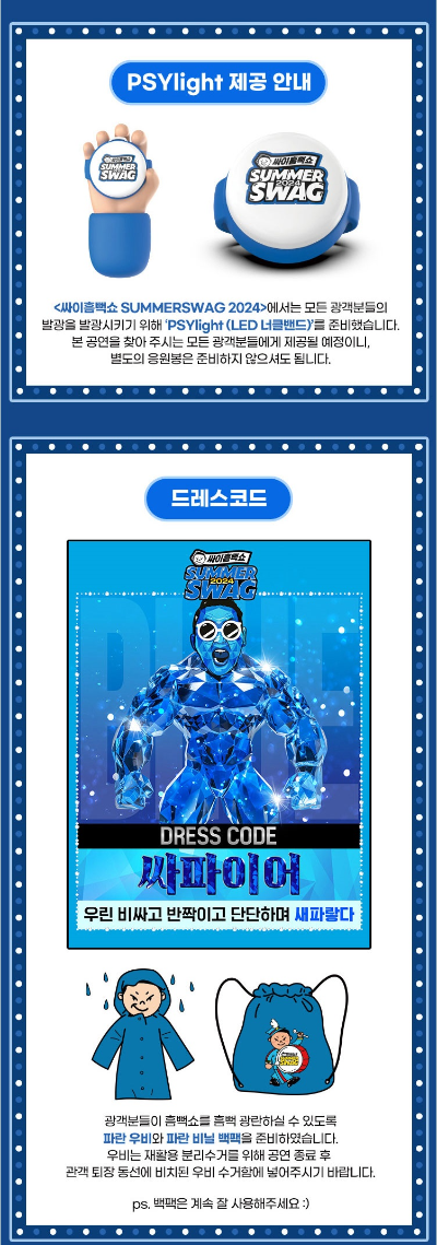 흠뻑쇼는 지정석에서 물을 많이 뿌리지만, 스텐딩 자리에 물이 더 많이 뿌려집니다. 더욱 즐겁게 즐기시려면 스텐딩 자리가 좋습니다. 체력이 약한 편이면, 스텐딩 뒷자리에서 쉬엄쉬엄 보시는 것을 추천드립니다. '24년 콘서트를 즐기기 위한 중요한 포인트 중 하나인 드레스 코드는 "싸파이어", 우린 비싸고 반짝이고 단단하며 새파랗다! 에 어울리는 드레스코드로 참석한다면 콘서트를 더욱 즐길 수 있습니다. 또 한 가지, 싸이 굿즈는 온라인 "11번가"에 "싸이 흠뻑쇼 굿즈" 또는 "싸이 인싸템"을 검색하거나, 공연 당일 공연장 공식 굿즈 판매처에서 오후 2시부터 구매 가능합니다.