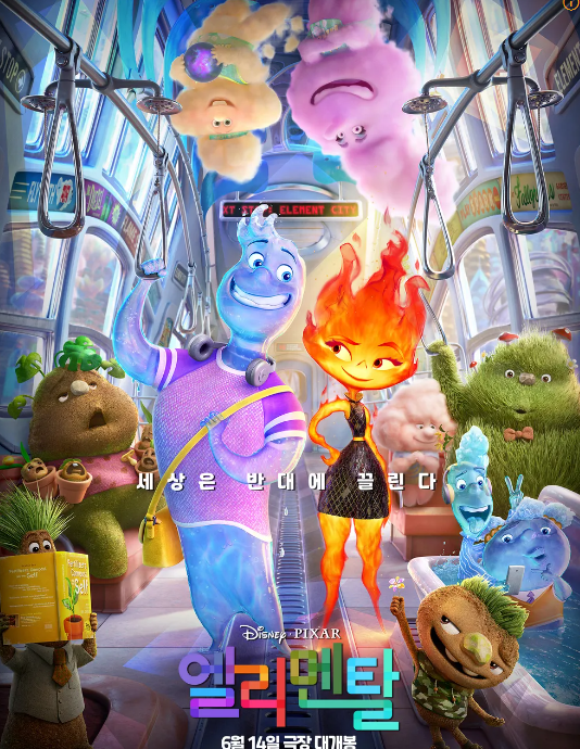 영화의 내용을 이끄는 관계는 '엠버' 불의가족, '웨이드' 물의 가족을 주축으로 이야기가 전개됩니다. 엘리멘트 시티에 살고 있는 4가지의 원소들은 현실에서 미국에 거주하는 여러 인종과 그들의 사회적 지위로 영화에 설정된 요소 입니다. 다만 아시아계의 특성이 비교적 뚜렷한 불 원소에 비해 나머지 세 원소는 그렇게까지 명확하지는 않은 편입니다. 불원소는 엘리멘트 시티를 처음으로 개척한 원이자 동시에 도시 내 대다수의 원소입니다.백인을 상징하는 요소로 설정된 것 같습니다. 영화 극 초반 엘리멘트 시티 중앙터미널 내 벽화들을 통해 도시 개척의 역사를 보여주는데, 물들이 바다에서 나오면서 '제1차 개척 원소'라고 알려줍니다. 그려진 내용은 전형적인 신대륙 이주자들의 모습으로, 바닷물이나 민물을 흡수해 몸집을 불릴 수도 있지만 한계가 있기 때문에 홍수 등의 재난과 같은 많은 물이 밀려오면 피해야 하는 것은 마찬가지입니다. 유동성 있는 신체로 벽과 파이프를 타고 다니거나 철책을 뚫고 지나다닐 수 있지만, 스펀지에 흡수되면 빠져나오기 굉장히 힘들어합니다. 흙은 두 번째로 엘리멘트 시티를 개척한 원소로, 몸에서 식물과 광물이 자랍니다. 4 원소 중 묘사가 가장 적은 편이며, 식물계 원소들끼리는 열매를 따는 것이 꽤 과한 애정행각에 들어가는지, 서로 열매를 따주다가 주역 2인에게 걸린 두 흙원소가 "그냥 다듬는 중"이라며 당황하는 모습을 보입니다. 공기는 세 번째로 엘리멘트 시티를 개척한 원소입니다. 비행이 용이한 점을 바탕으로 '에어볼'이란 스포츠를 많이 하는데, 물이나 흙 원소들도 즐겨볼 정도로 엘리멘트 시티의 인기 스포츠입니다. 불은 본래 파이어랜드에서 살던 일부 불 원소들이 가장 나중에 엘리멘트 시티에 합류하였습니. 그래서인지 제3차 개척 원소까지 물, 공기, 흙이 다 있지만 4 원소 중 하나임에도 불구하고 불은 4차 개척이라는 타이틀도, 그림도 없습니다. 장작이나 기름, 숯 등 연소에 필요한 물질을 식재료로 삼으며, 물이 닿아 몸 일부가 꺼지더라도 음식을 먹으면 복구가 가능합니다. 4 원소 중 마지막으로 엘리멘트 시티에 온 데다 다른 것을 태우는 원소 특성 때문에 경계도 받는데, 그래서인지 별다른 편의시설도 제공받지 못하고 불의 특성으로 인해 다른 원소에게 본의 아닌 민폐를 끼치는 점에서 아시아계 미국인 같은 미국의 이민자 집단을 상징하는 것으로 보입니다. 이러한 영화의 설정 요소는 영화에 호기심과 흥미를 유발하게 합니다.