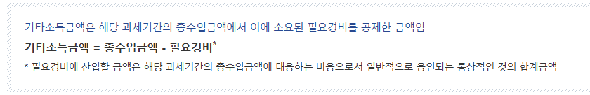 일시적으로 발생한 소득을 말하며 상금이나 사례금, 복권 당첨금, 보상금 등을 말합니다 이때 강연료 또한 기타 소득으로 잡히기 때문에 외부 강연이나 교육 행사가 많은 경우 기타 소득이 높게 잡힐 수 있습니다.