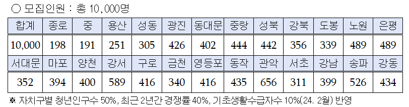 ■ 모집인원: 10,000명으로 지역별로 상이하니, 아래의 표의 지역별 인원을 참고하시기 바랍니다.