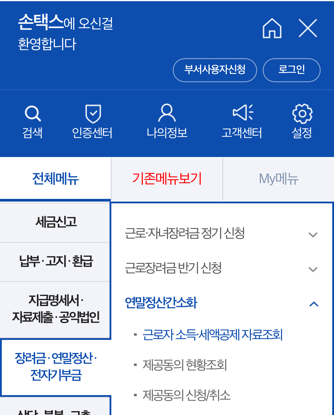 • 홈 화면 상단 메뉴 → 장려금,연말정산,전자기부금 → 연말정산 간소화 → 근로자 소등공제 자료 조회