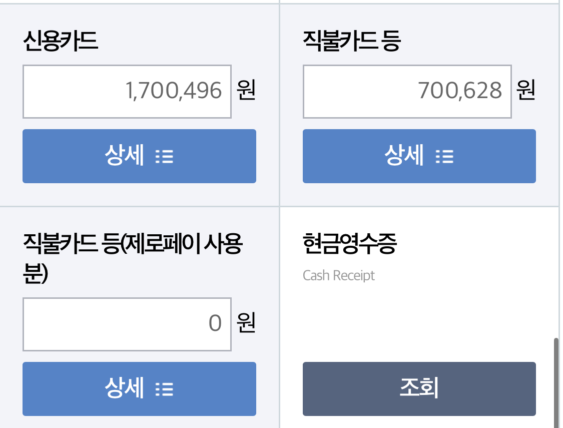 • 주의할 점은, 연말정산 신청시 부양가족이 있는 경우 합산한 금액이 나오기 때문에, 상세를 클릭하여 나의 금액만 아래와 같이 확인할 수 있습니다.