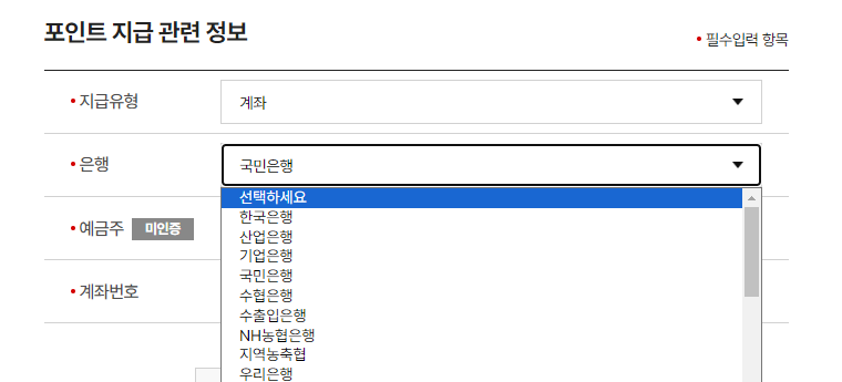계좌로 신청하는 경우 은행을 선택하여 등록하시면 됩니다.