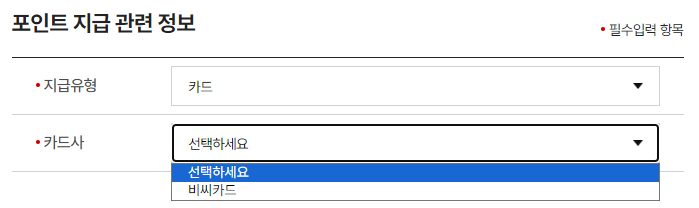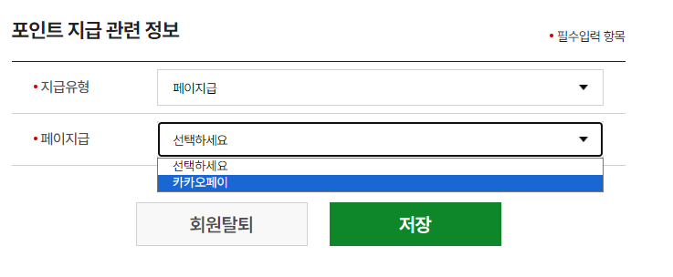 현금, 신용카드사 포인트, 카카오 페이 중 포인트 지급 유형을 선택하여 수령 가능합니다.