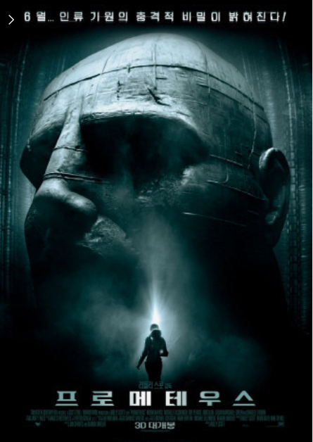 "프로메테우스"는 2012년 제작된 리들리 스콧(Ridley Scott) 감독의 SF 영화입니다. 영화는 2089년 고고학자 커플 엘리자베스 쇼와 찰리 할로웨이는 서로 한 번도 접촉한 적 없는 고대 문명의 유적에서 당대 기술로 관측 불가능한 별자리가 공통적으로 묘사되어 있음을 발견합니다. 그들은 이것이 인간의 창조자들이 보낸 초대장이라 생각합니다. 웨이랜드 그룹의 피터 웨이랜드 회장은 이 두 과학자의 얘기를 듣고 인류 기원 탐사 프로젝트를 발진해서 문제의 별자리를 찾기 위한 기획에 착수합니다. 마침내 찾아낸 별자리에서 LV_223이라는 행성에서 유일하게 생명이 살았을법한 환경을 갖추었음이 밝혀냈고 쇼와 찰리는 LV_223를 향해 떠나는 과학탐사용 우주선 프로메테우스호에 탑승합니다. 2년이라는 항해 끝에 2093년 12월에 LV_223에 도착했고, LV_223에 진입해 지표면을 탐색하던 프로메테우스호는 외계인의 흔적이 있음을 감지합니다. 탐사를 통해 인공적으로 만들어진 거대 외계 건축물을 발견했고, 인간이 호흡하기에 괜찮은 산소가 건축물에서 생성되고 있음을 발견하였습니다. 탐사대원들은 그곳에서 참수당한 머리 없는 엔지니어 시체와 검은 액체를 발견하여 탐사선으로 가져옵니다. 프로메테우스 호에서 외계인 머리를 조사하는데, 이 외계인의 DNA가 인간과 일치하다는 것을 알고 충격을 받습니다. 탐사대원들이 이곳에서 일명 엔지니어라는 인류의 창조주를 찾아다니는 내용을 담고 있습니다.