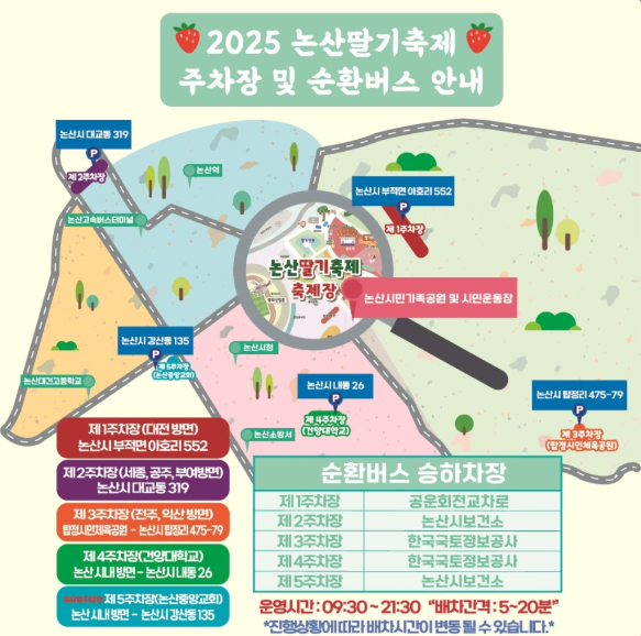• 운행 코스: 각 주차장에서 축제장까지 연결되며, 주요 정류장은 기민중학교 앞 정류장(공운교) 및 건강관리센터 정류장입니다.
