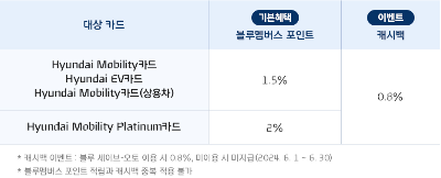 6월의 현대 모바일카드 신차구매 혜택은 최대 2% 블루멤버스 포인트 적립 또는 최대 0.8% 캐시백을 지급하고 있습니다. 개상 카드별 기본 혜택과, 캐시백 이벤트 등이 다를 수 있으니 위에 표를 참고하시기 바라며, 2~3개월 무이자 할부, 최대 60개월 6.1%유이자 할부까지 혜택을 누리실 수 있습니다.
