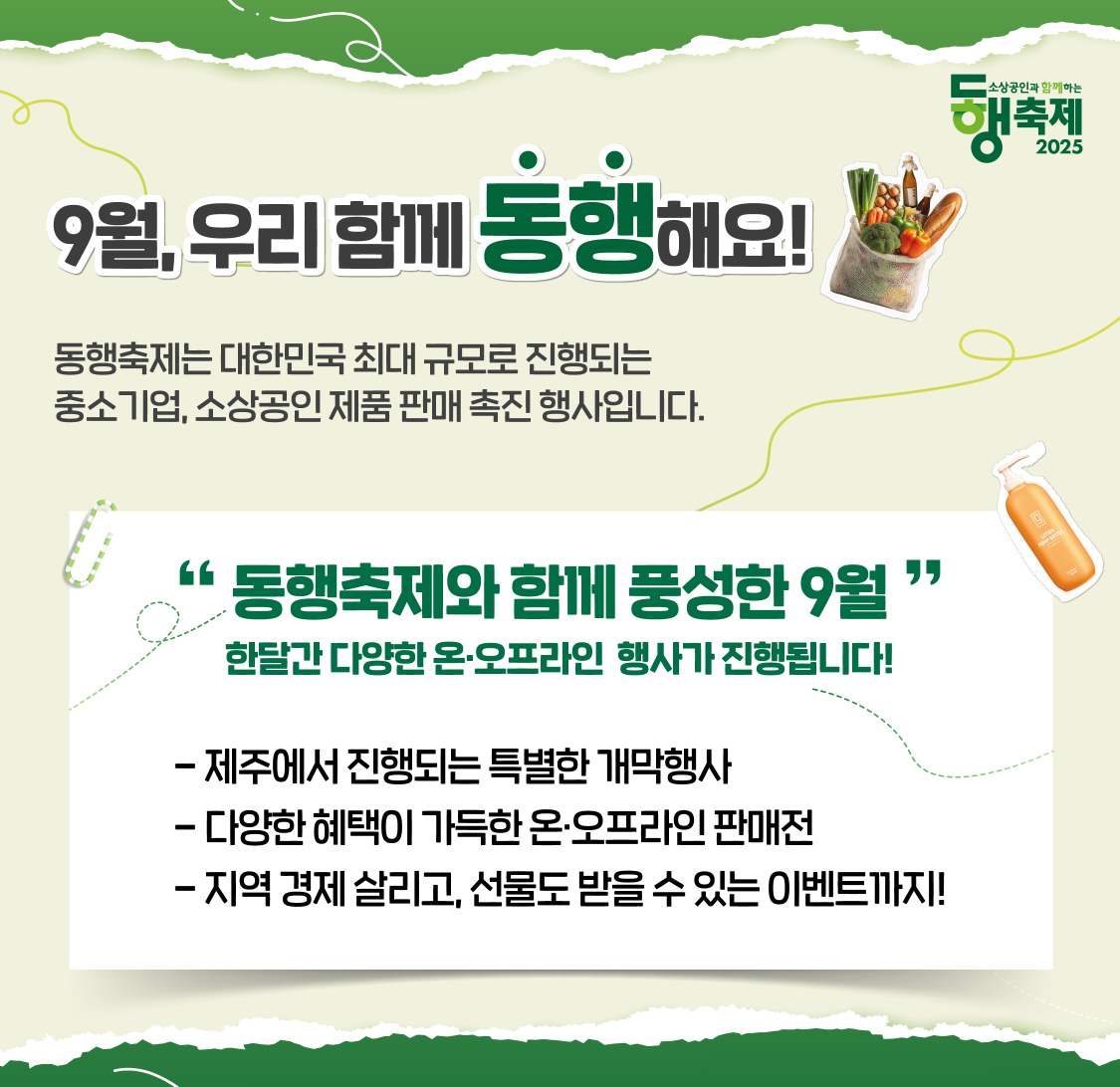 2025년 9월에 진행하는 동행축제는 역대 최대 규모로 진행하는 소비 촉진 축제입니다. 9월 한달간 온오프라인 행사가 진행되며, 다양한 이벤트도 참여할 수 있습니다.